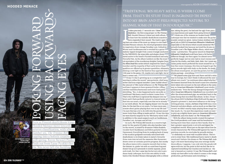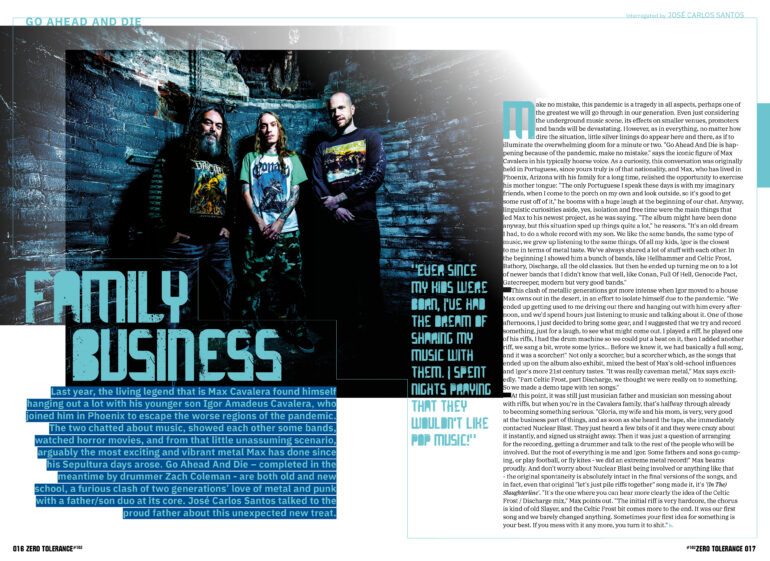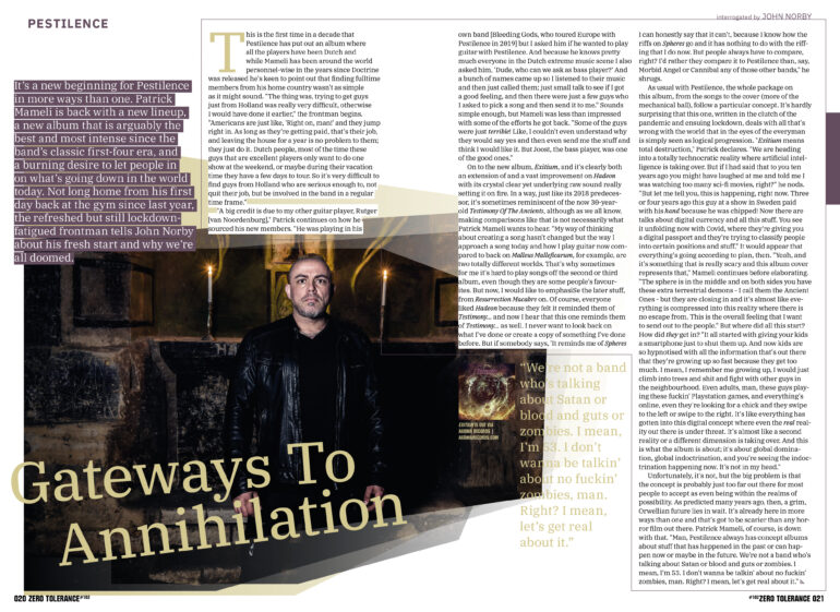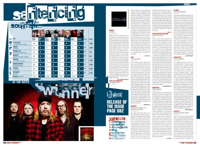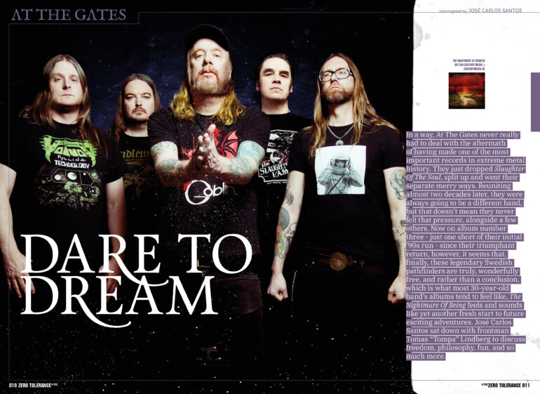 The other tangible good news is that we are able to welcome Swedish legends At The Gates to this issue’s cover! We were lucky enough to have them on the cover back in 2014 when they reformed, but a proper catch up is in order as it’s fair to say that a lot has happened since then – and in AtG’s case, the arrival of their new full-length album, The Nightmare Of Being (pretty apt title, right?) marks another high point in their existence. Despite it being met with slightly mixed views so far here at ZT, it’s obviously still very good as it’s managed to win the issue’s soundcheck, and that’s not easy as we’re a picky bunch. José Carlos Santos didn’t get caught up in any negative conversations, choosing instead to settle down to a lengthy chat with AtG’s chosen representative, Mr Tomas “Tompa” Lindberg… The fruits of this conversation can be found on pages 010-015. But really, as well as AtG, you’re spoilt for choice – the net has been cast far and wide as you’ll discover when you read on. So, enjoy the issue and we’ll see you with the next one in September. Publication dates, subscriptions and all sorts of other stuff is available on our website – www.ztmag.com. Keep it bookmarked as that’s where we post anything related to ZT first.